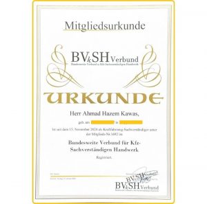 Dieses Zertifikat bestätigt die Qualifikation von Ahmad Hazem Kawas als Sachverständiger für Kraftfahrzeugschäden und -bewertung. Es unterstreicht unseren Anspruch an eine fachlich fundierte, strukturierte und nachvollziehbare Arbeitsweise – für Kfz-Gutachten, Wertgutachten, Reparaturbestätigung und 360°-Fahrzeugscan.