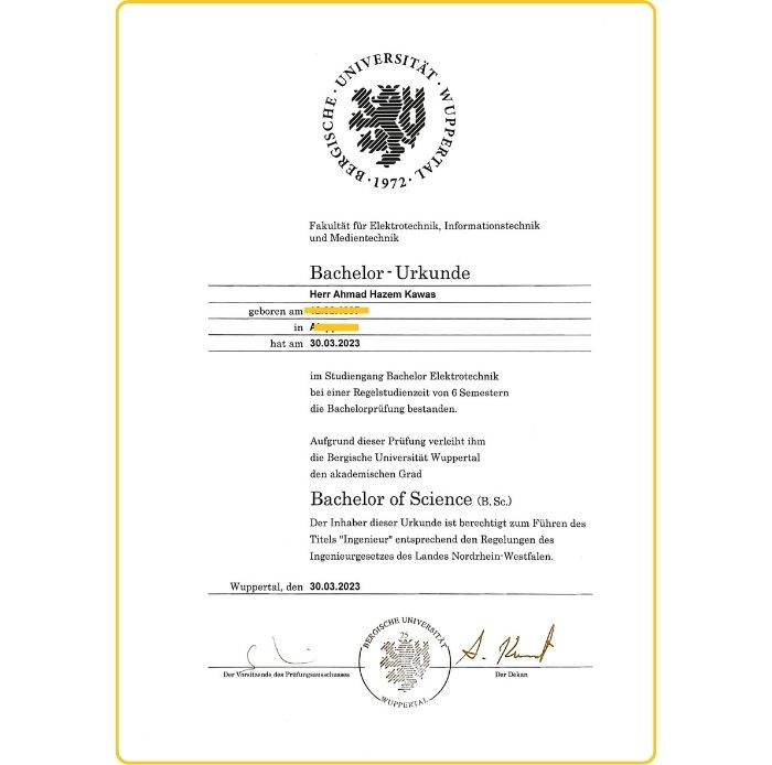 Hinter Carscann-kfz Gutachter steht Ahmad Hazem Kawas. Der Bachelorabschluss an der Bergischen Universität Wuppertal unterstreicht einen technischen und analytischen Hintergrund – wichtig für eine strukturierte Arbeitsweise, saubere Dokumentation und nachvollziehbare Ergebnisse.