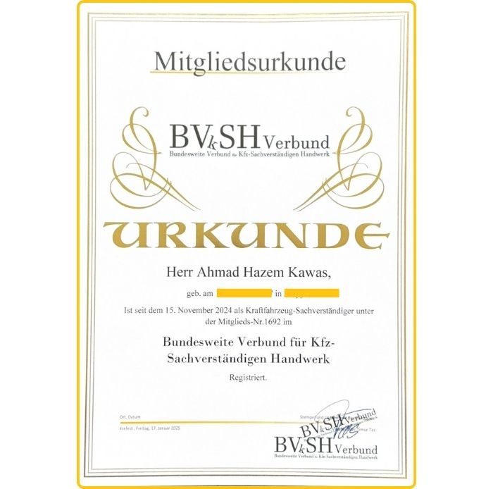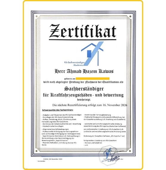 Dieses Zertifikat bestätigt die Qualifikation von Ahmad Hazem Kawas als Sachverständiger für Kraftfahrzeugschäden und -bewertung. Es unterstreicht unseren Anspruch an eine fachlich fundierte, strukturierte und nachvollziehbare Arbeitsweise – für Kfz-Gutachten, Wertgutachten, Reparaturbestätigung und 360°-Fahrzeugscan.